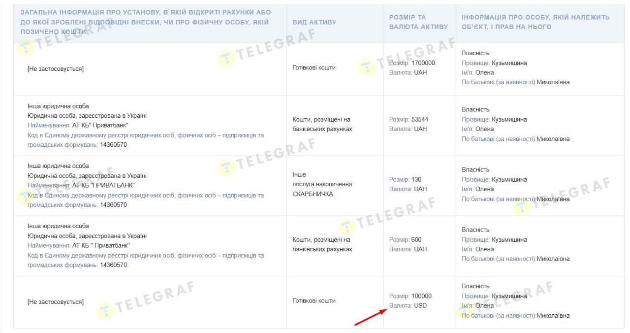 У 2023 році при річній зарплаті у 2 978 529 гривень (приблизно 248 210 гривень на місяць), її доларові заощадження зросли на 25 тисяч доларів, а гривневий рахунок зменшився до 53 544 гривень.