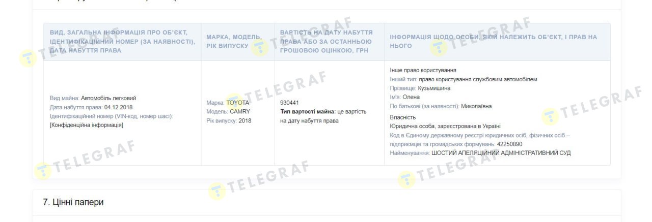 - Автомобіль TOYOTA CAMRY 2018 року випуску, придбаний за 930 тисяч гривень.