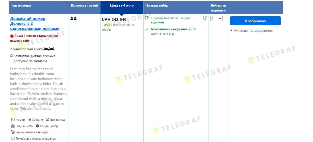 Вартість 1 ночі тут сягає десятків тисяч гривень. До прикладу, у найближчі вільні дати (1-5 листопада, а це уже далеко не високий сезон) на сайті Booking вартують понад 242 тисячі гривень (найменший термін бронювання — 4 ночі). Тобто виходить понад 60 000 за ніч у найдешевшому двомісному номері цього готелю.
