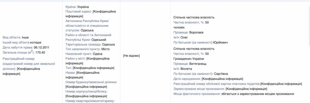 Жінка у своїй податковій звітності зазначила, що її чоловік Олег Воропаєв разом з адвокатом Віолетою Витяганець спільно у рівних частках володіють котеджем площею 170,4 кв. м в Одесі. При цьому право власності оформлене з 2011 року. Погорєлова не вказала, чи має вона право на користування цим майном, а також не зазначила вартість цього майна у декларації.