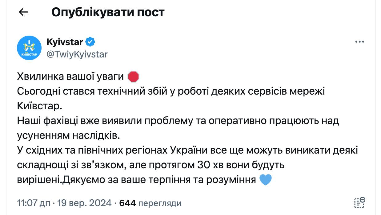За словами представників компанії, у східних та північних областях України ще можуть спостерігатися деякі проблеми зі зв’язком, але протягом 30 хвилин вони будуть усунені.