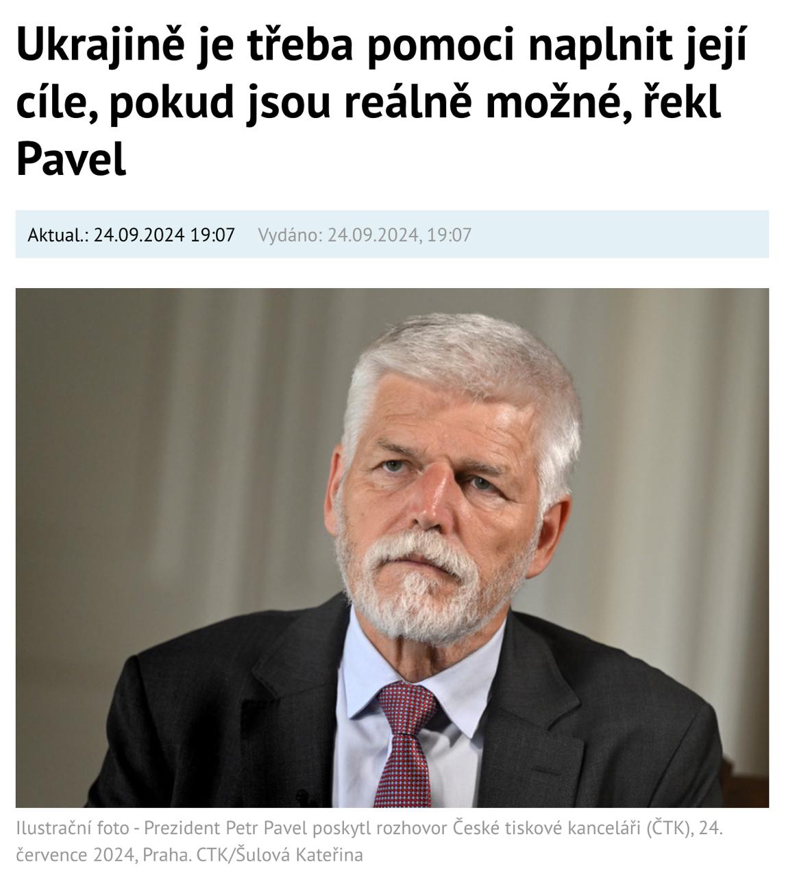 Як повідомляє Ceske noviny, Петр Павел позначив "надії на те, що війна закінчиться повною перемогою України протягом кількох тижнів або місяців" як "небезпечні для всіх".