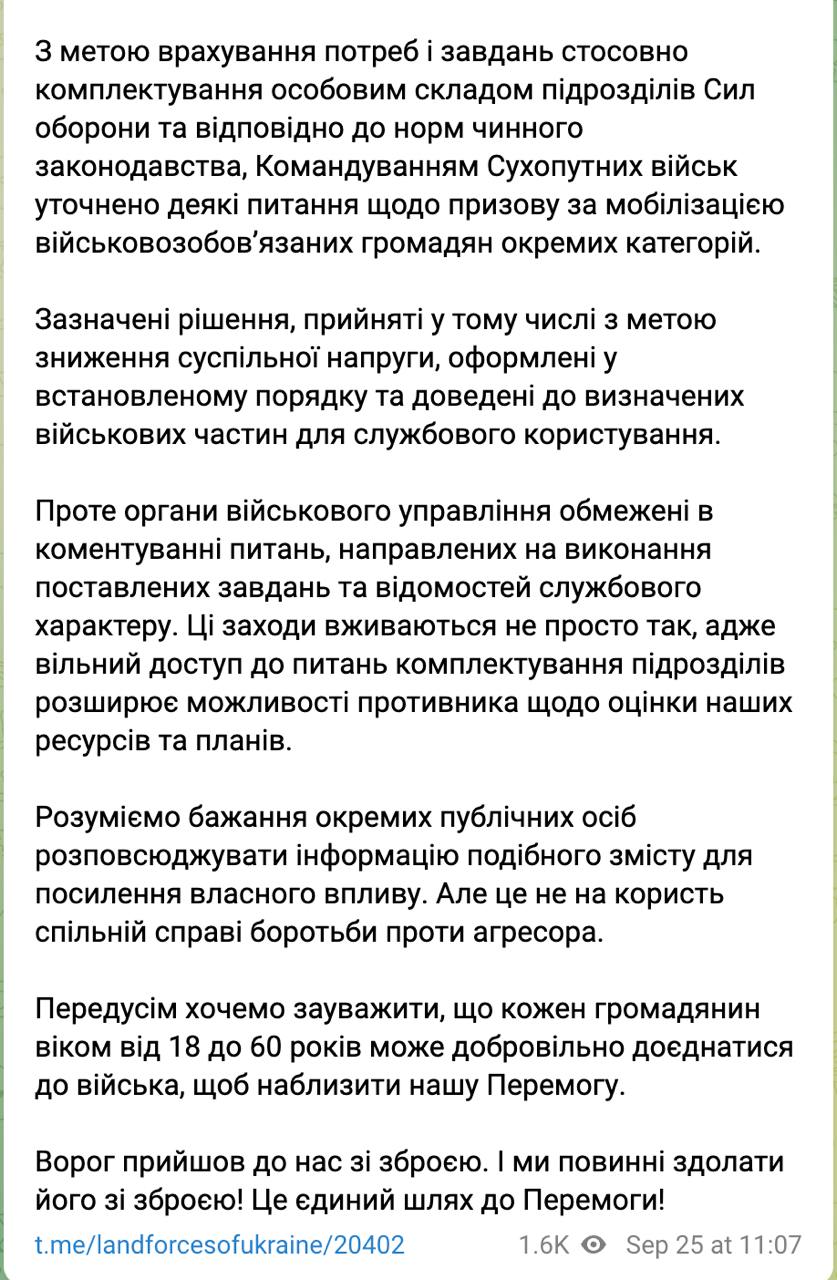 Командування Сухопутних військ підтвердило, що видало вказівку щодо уточнення віку для мобілізації громадян.