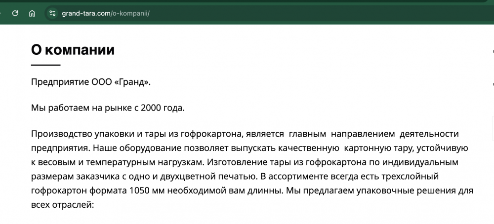 Вказується, що підприємство працює на ринку з 2000 року. Виробництво упаковки та тари з гофрокартону є основним напрямком діяльності підприємства. Також там приймають макулатуру. Для зв’язку надані російські телефони.