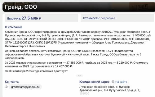 Компанія «Гранд» знаходиться за тією ж адресою, що й за українською реєстрацією. Указується, що за минулий рік дохід компанії склав 27,48 млн рублів, а прибуток — 8,2 млн рублів. На підприємстві, нібито, працюють 10 робітників. Керівником фірми є Сергій Ліпченко.