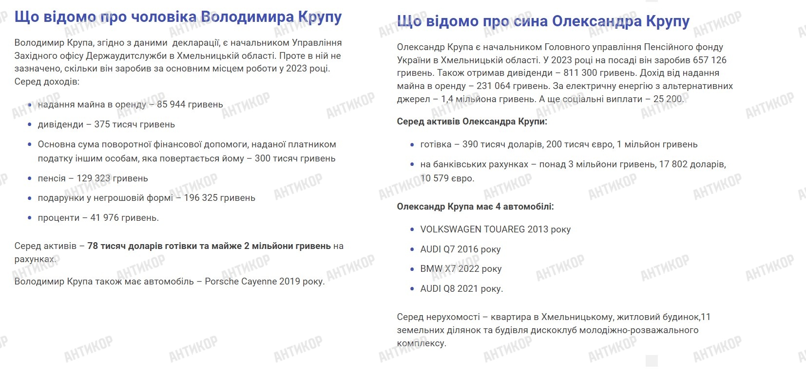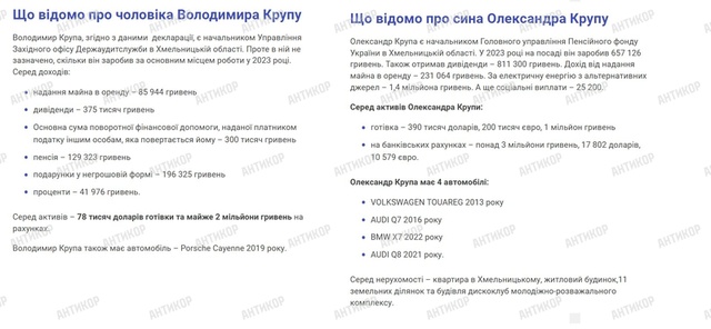 Далі було більше – всі почали шукати інформацію, хто ж така Тетяна Крупа і її сім’я, у яких вилучили таку колосальну суму готівки. Виявилося, що вся сім’я – зразкові чиновники і паралельно успішні бізнесмени. Тетяна Крупа з 2008 року очолює Хмельницький обласний центр медико-соціальної експертизи”; чоловік - Володимир Крупа, багаторічний керівник Державної фінансової інспекції у Хмельницькій області, колишній голова Хмельницької РДА; син - Олександр Крупа, голова головного управління Пенсійного фонду у Хмельницькій області.