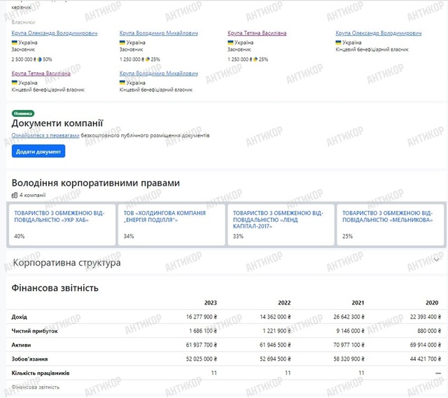 Всі троє Круп також є власниками ТОВ «Солар-інвест», яке займається виробництвом сонячної електроенергії. Ця фірма, своєю чергою, володіє корпоративними правами у чотирьох інших: ТОВ «Укр хаб», ТОВ «ХК Енергія Поділля», ТОВ «Ленд Капітал 2017» та ТОВ «Мельникова». Забігаючи наперед – дохід від бізнесу, яким Крупи будуть пояснювати шість мільйонів доларів готівкою, значно менший, ніж вилучені лише у кабінеті Тетяни Крупи 100 тисяч доларів.