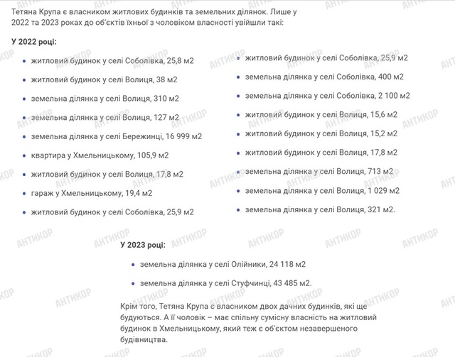 Якщо подивитися декларацію Тетяни Крупи, то виявиться, що після початку повномасштабної війни та мобілізації її активи, й до того немаленькі, почали різко зростати – у 2022-23 роках, коли мобілізація набирала обертів, Тетяна Крупа оформила на себе та чоловіка цілу низку нерухомості.