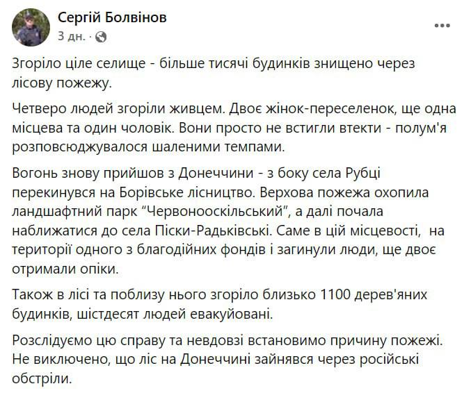 "Чотири людини згоріли живцем. Дві жінки-переселенки, ще одна місцева мешканка та один чоловік. Вони просто не встигли втекти – полум’я поширювалося з неймовірною швидкістю", - написав він.