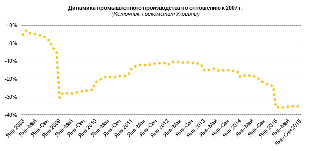 Як показують дані Укрстату, промислове виробництво в Україні не змінювало свого негативного тренду з 2008 року. І навіть у кризу 2008-2009 років темпи уповільнення падіння показника були вищими, ніж нині.