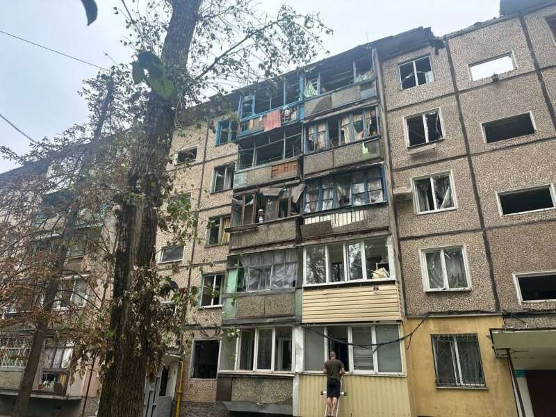 У пошкодженому п’ятиповерховому будинку зруйновано дах. В одному з під’їздів знищено сходову клітку. Із пошкодженої частини будинку врятували шістьох осіб.