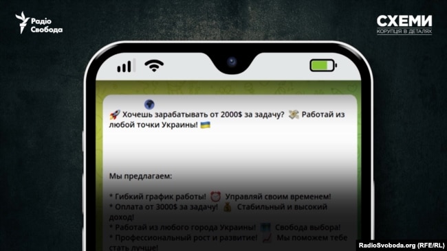 Ось одне з таких: «Хочеш заробляти від 2000 доларів за завдання? Робота з будь-якої точки України. Вік від 16 до 50 років».