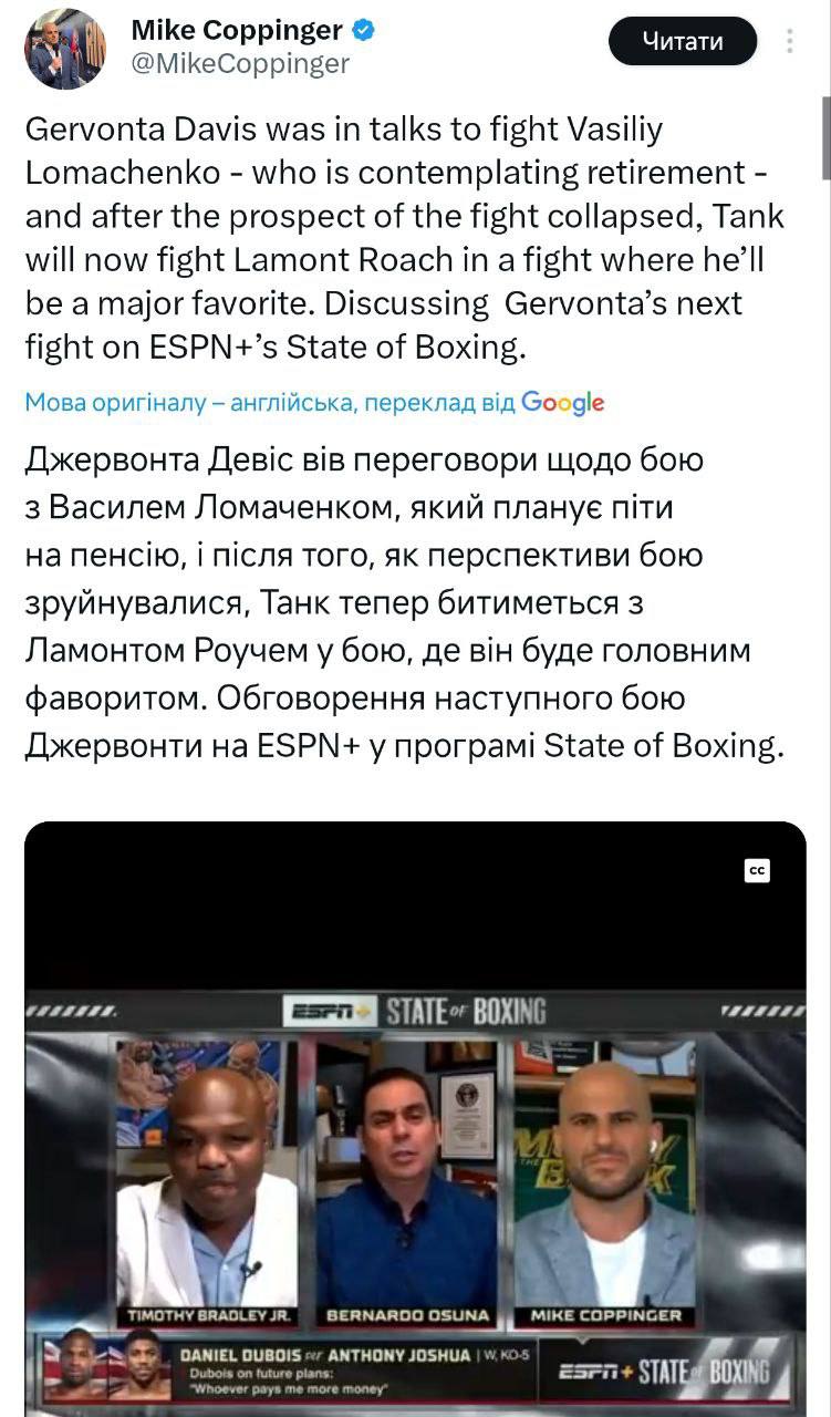 "Я знаю, що Джервонта Девіс вів переговори з Василем Ломаченком. Але перспектива цього бою провалилася, адже українець збирається піти на пенсію".