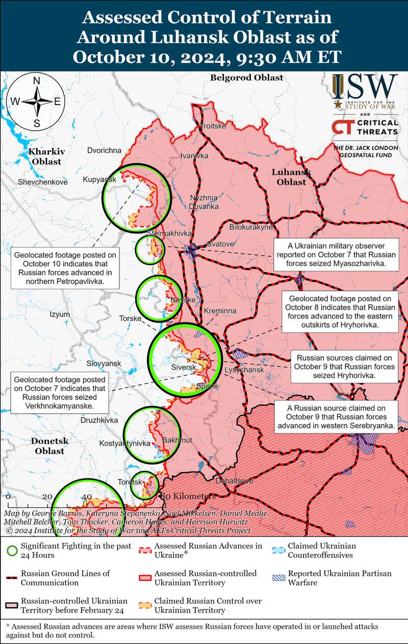 За останню добу (10 жовтня) в Україні сталося 169 бойових зіткнень. Противник завдав шість ракетних ударів по наших позиціях та населених пунктах (використавши 17 ракет), 71 авіаційний удар (114 КАБів), здійснив 4672 обстріли (понад 180 з них – із реактивних систем залпового вогню).