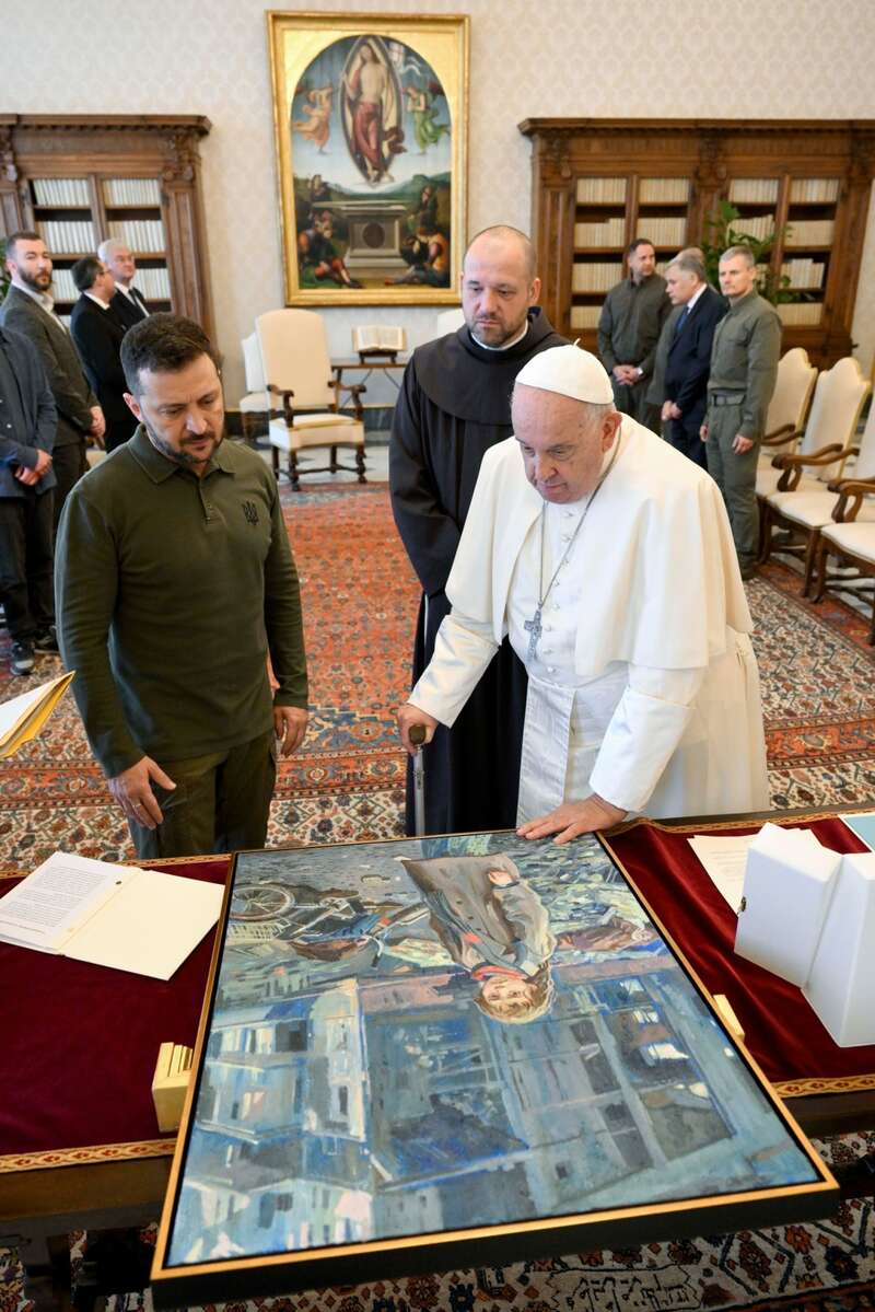 Зеленський подарував Папі картину, написану олією, на якій зображена «Різанина в Бучі. Історія Марічки», повідомляє італійське інформагентство.