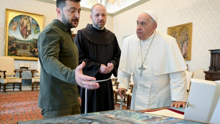 Після приватної розмови в Sala della Biblioteca та представлення української делегації Папа Римський вручив Зеленському бронзовий барельєф із зображенням квітки, що розквітає, з написом «Мир – це тендітна квітка».