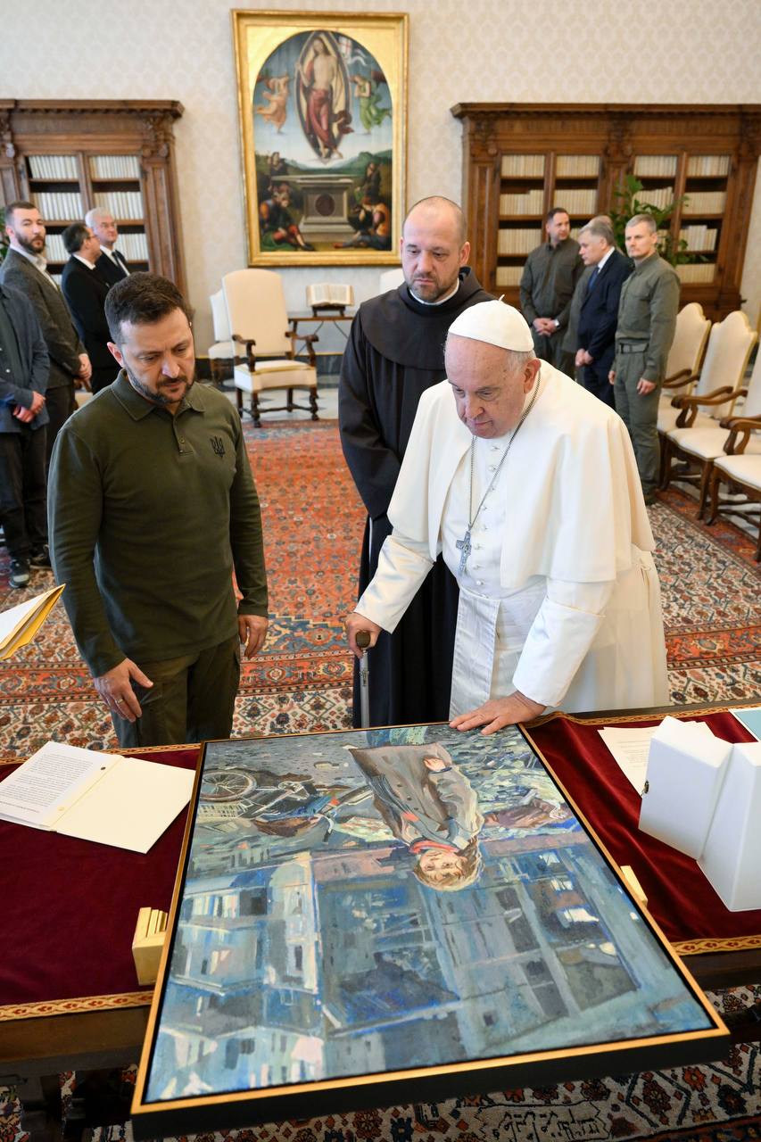 Президент України Володимир Зеленський підніс Папі Римському Франциску картину «Бучанська різанина: Історія Марічки».
