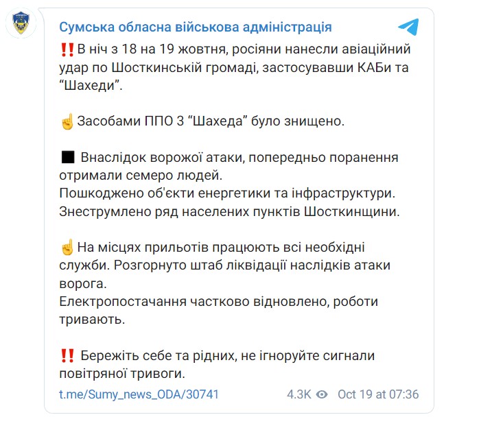 «У ніч на 19 жовтня росіяни завдали авіаційного удару по Шосткинській громаді, використовуючи КАБи та «шахеди», – йдеться у повідомленні.