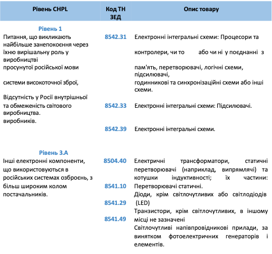 Деякі з компонентів були визначені як нещодавно виготовлені (між 2021 і 2023 роками). Ці компоненти були віднесені до Рівня 1 або Рівня 3 Спільного списку високих пріоритетів (ССПП), розробленого BIS у співпраці з Європейським Союзом, Японією та Великою Британією.15 Зокрема, коди 8504.40, 8541.49, 8542.31, 8542.33, 8542.39. Крім того, один з компонентів, вироблених компанією NXP, підлягає більш суворому експортному контролю США, оскільки він підпадає під групу товарів 3A911A згідно з класифікаційним номером експортного контролю США (ECCN).