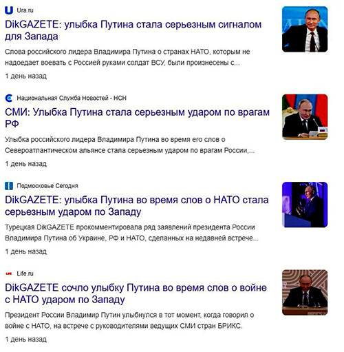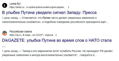 «Путін знову розширює міміку і знову посміхається, зовсім трохи, і каже дуже серйозно: А коли натовцям набридне воювати з нами? Запитайте їх і про це. Ми готові продовжувати цю боротьбу. І перемога буде за нами, — підкреслив він. Подібні заяви Путіна з посмішкою — це один із найсильніших ударів, завданих ворогам Росії», — йдеться у матеріалі.