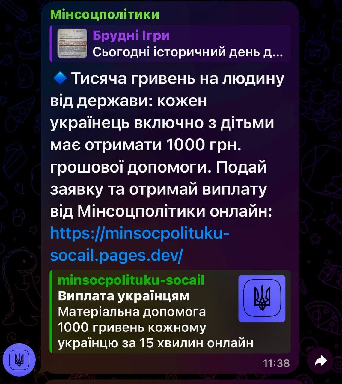 У коментарях на каналах у Telegram з’явилися посилання на ресурси, що нібито належать Міністерству соціальної політики, які обіцяють українцям виплату 1000 грн від держави.