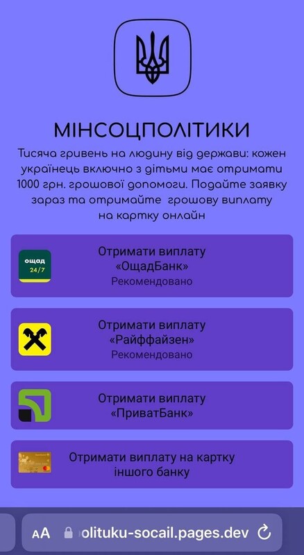 Однак, переходячи за цими посиланнями, громадяни потрапляють на фальшиві сайти, які просять ввести персональні дані своїх банківських карток. У результаті шахраї отримують доступ до коштів жертв.