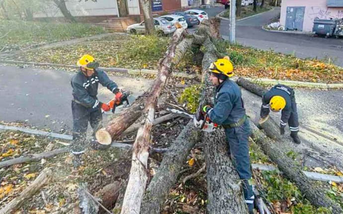 Рятувальники комунальної аварійно-рятувальної служби (КАРС) "Київська служба порятунку" прибирають повалені дерева в різних районах столиці та демонтують аварійні конструкції на дахах і фасадах будинків, що пошкоджені внаслідок сильного вітру.