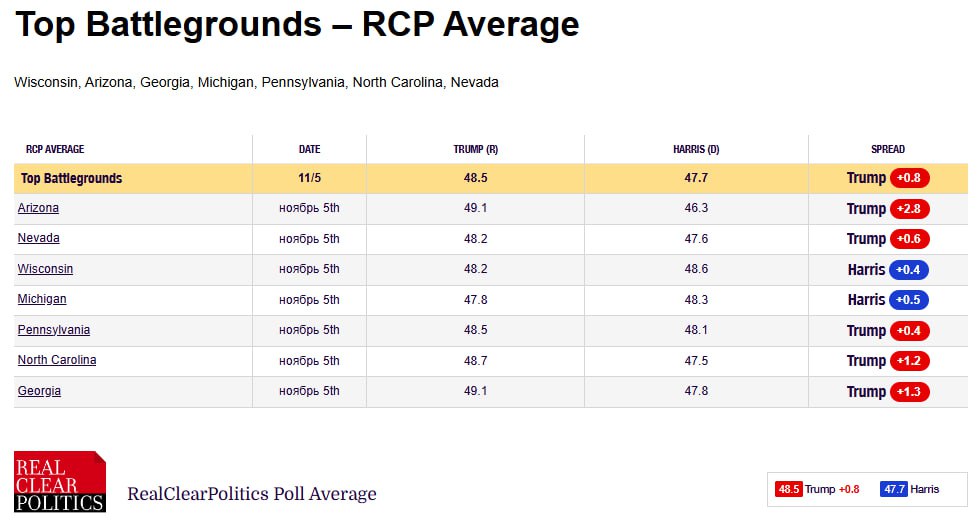 Дональд Трамп випереджає Камалу Гарріс у більшості хитких штатів.