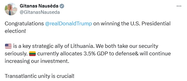 Президент Литви Гітанас Науседа у своєму вітанні Трампу зазначив, що США – ключовий стратегічний партнер для Литви.