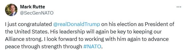 До привітань приєднався і генеральний секретар НАТО Марк Рютте, який повідомив, що щойно привітав Дональда Трампа з обранням.
