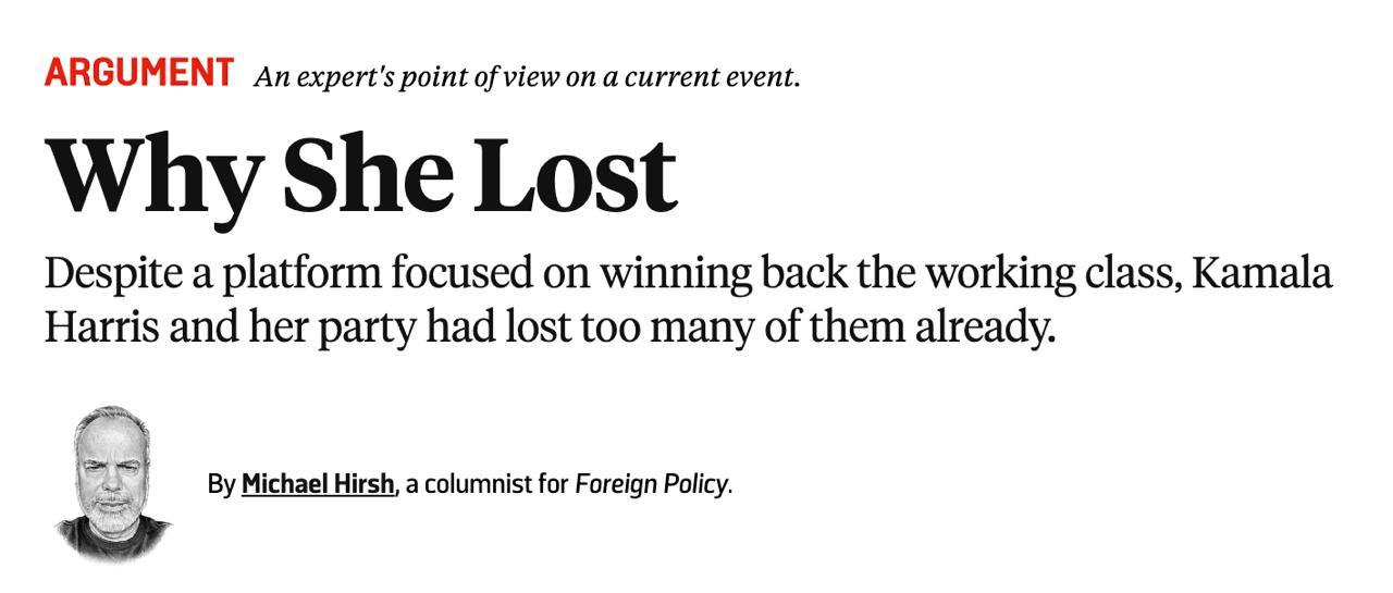 «На практиці перед Гарріс стояло практично неможливе завдання — подолати постійне невдоволення низькими рейтингами Байдена, коли близько 2/3 виборців вважають, що країна рухається в неправильному напрямку», — пише Гірш.