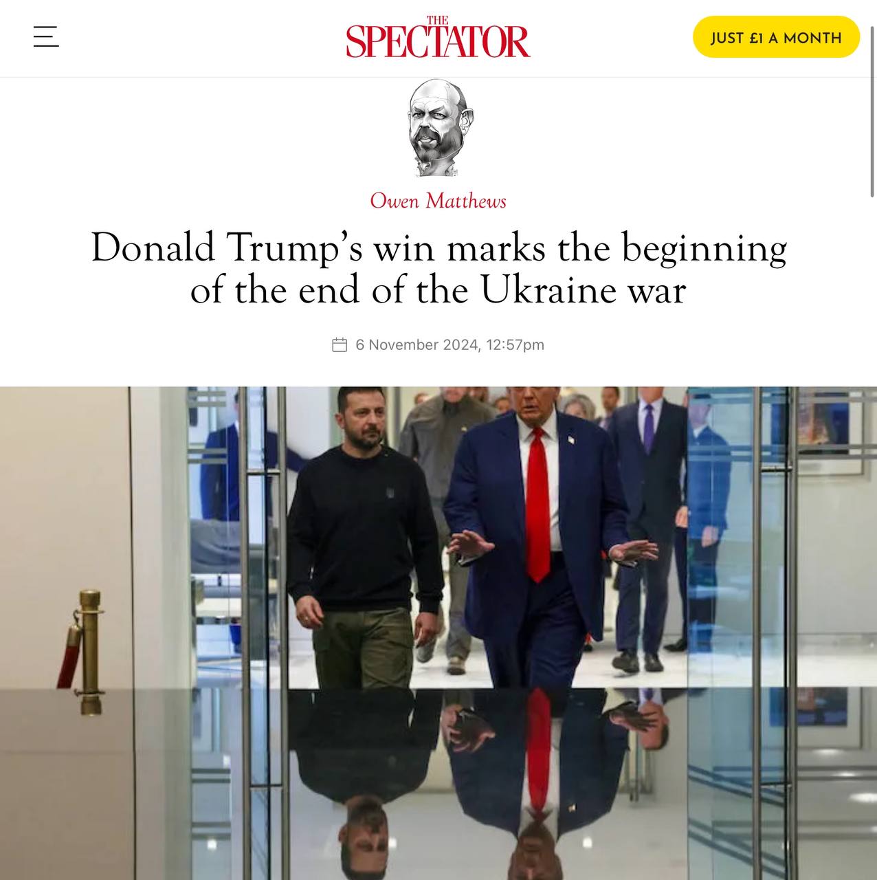 The Spectator опублікував статтю з заголовком: «Перемога Дональда Трампа ознаменує початок кінця війни в Україні».