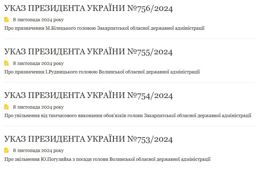 На його офіційному сайті були опубліковані укази про відставку голови Волинської обласної державної адміністрації Юрія Погуляйка та про призначення Івана Рудницького на його місце.