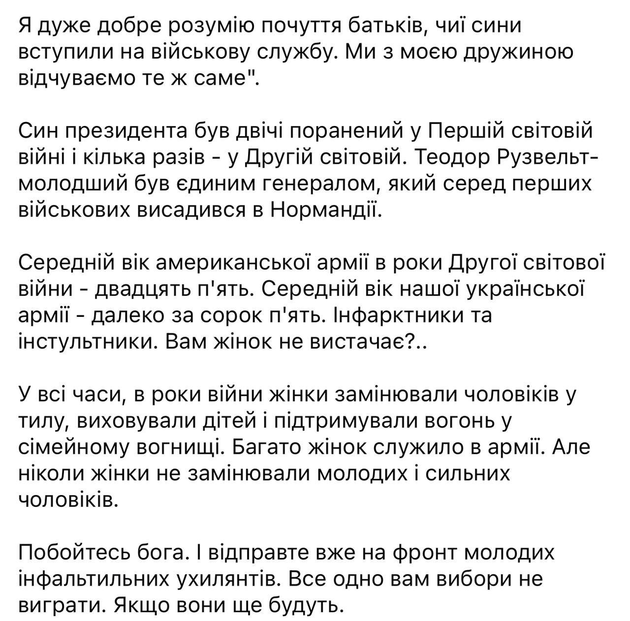 Касьянов у дописі цитує американського президента Франкліна Рузвельта, котрий у часи війни у 1942 році запропонував зменшити мобілізаційний вік з 20 до 18 років: