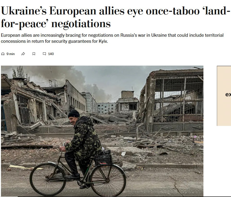 Представники країн Європи та НАТО визнають, що обговорення стосовно територіальних поступок вже не викликають такого подиву, як раніше, і дипломати формулюють це не як «земля в обмін на мир», а швидше як земля в обмін на безпеку України.