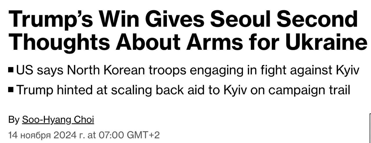 Південна Корея може відмовитися від свого плану щодо постачання зброї в Україну в зв’язку з перемогою Трампа, повідомляє Bloomberg, посилаючись на свої джерела.