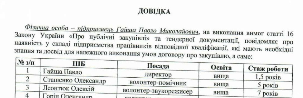 Цікаві моменти є і в самих тендерних пропозиціях. Наприклад, однаково підписані назви документів. Або ж спільні співробітники у довідці про наявність працівників, що мають відповідну кваліфікацію для надання послуг.