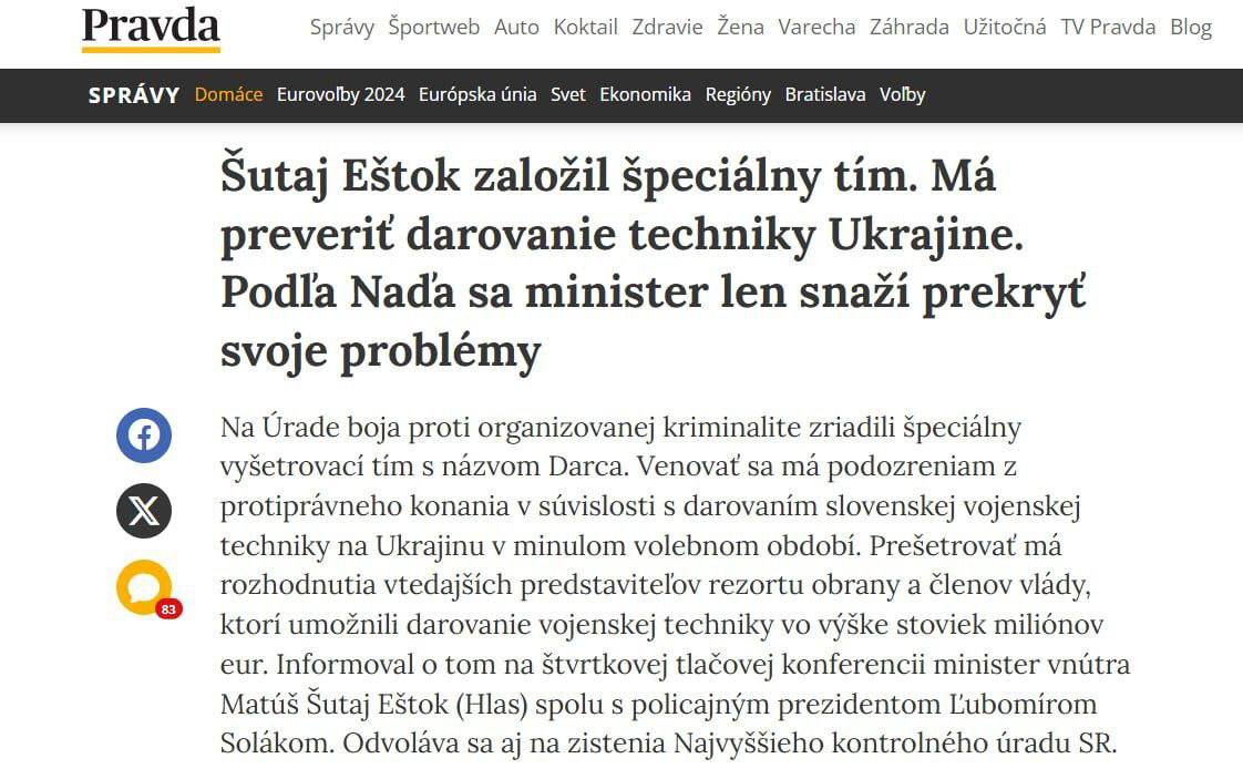 Ідеться про період із 2022 по 2023 роки. Міністр МВС Шутай Ешток заявляє, що передача озброєнь призвела не лише до «знищення» обороноздатності Словаччини, а й спричинила фінансові втрати.