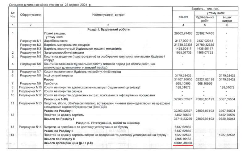 Держаудитслужба почала моніторинг тендеру 20 вересня і виявила порушення вимог Настанови з визначення вартості будівництва. Фірма «БК «Мега Стайл» подала у складі тендерної пропозиції договірну ціну, в яку були включені «понесені витрати згідно з Довідкою від 18.06.2024 №532» у сумі 350 тис грн, що не відповідає вимогам V розділу Настанови щодо визначення вартості об’єкта будівництва при складанні ціни пропозиції учасника процедури закупівлі (договірної ціни). Що це за витрати, неясно.