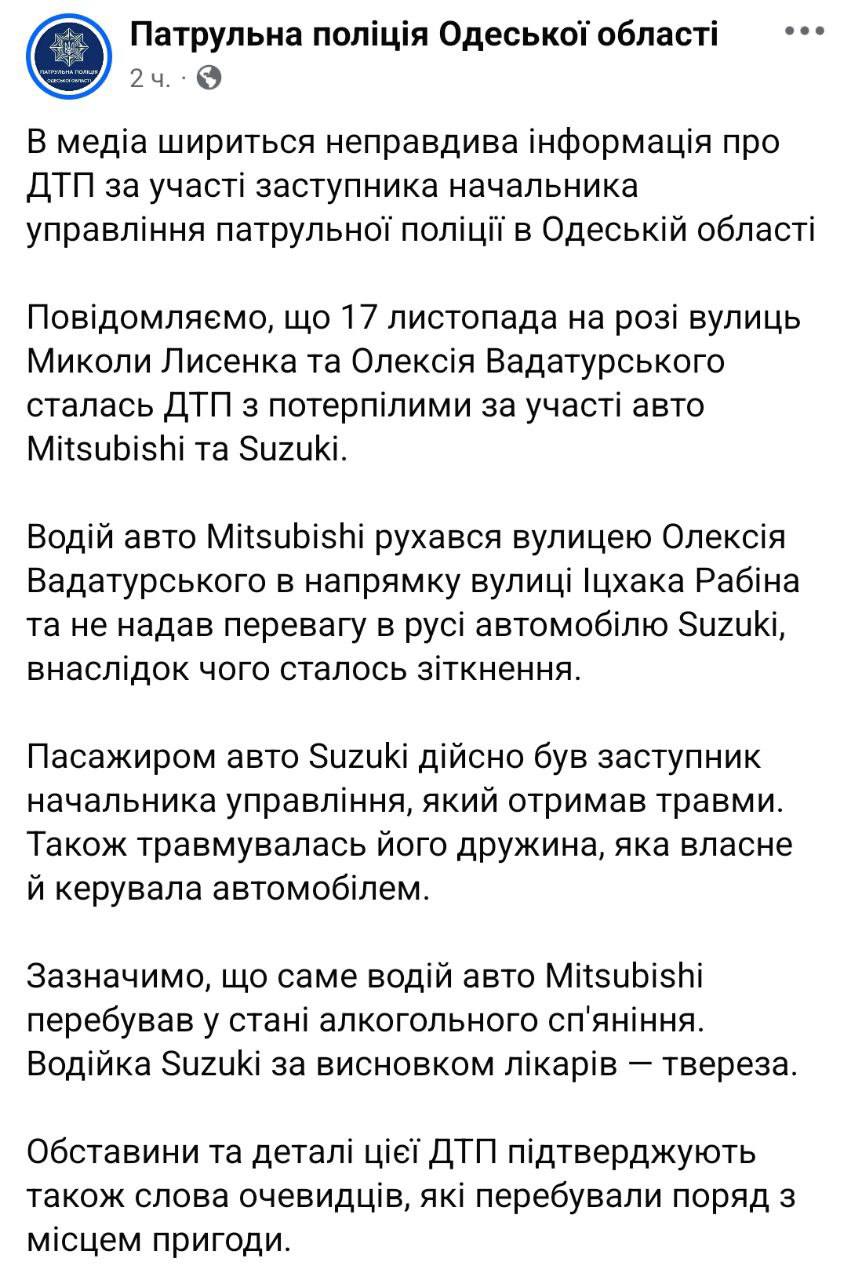 Заступник начальника управління патрульної поліції Одеської області потрапив у ДТП 17 листопада. Проте в медіа поширюється неправдива інформація про деталі цього інциденту.