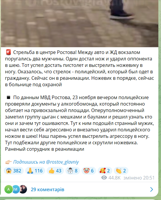 "За даними МВС Ростова, 23 листопада ввечері поліцейські перевіряли документи у чоловіка, який постійно перебуває на привокзальній площі. Оперуповноважений помітив групу циган з мішками та вирішив з’ясувати, хто вони та чому там перебувають. Тут до них підійшов дивний чоловік, почав поводитися агресивно і раптово вдарив поліцейського ножем у шию! Наш співробітник встиг вистрілити в ногу агресорові. Тут підбігли інші поліцейські та затримали нападника", – пише ростовський паблік.