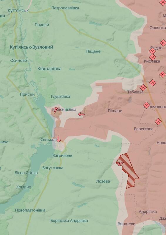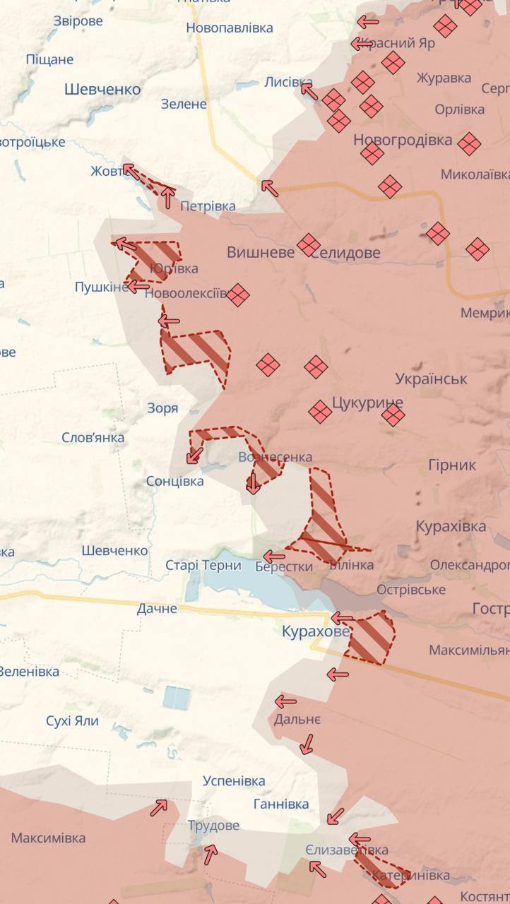 Зазначається просування в самому Кураховому зі східного боку, а також північніше, вздовж берега водосховища, і південніше, в "кишені", яку поступово залишають ЗСУ.