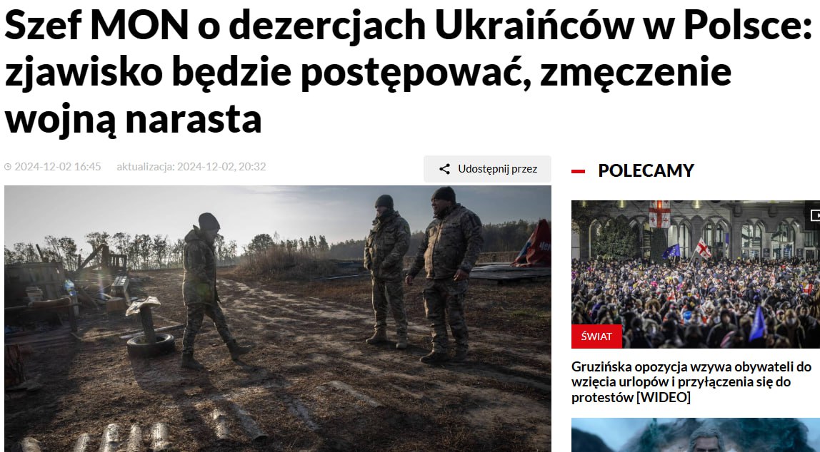 «Масштаби дезертирства незначні. Це явище присутнє, але не ставить під загрозу тренувальний процес. Звісно, ситуація буде ускладнюватися з продовженням конфлікту… Однак, я вважаю, що ситуація в самій Україні набагато складніша», - зазначив міністр Косіняк-Камиш.