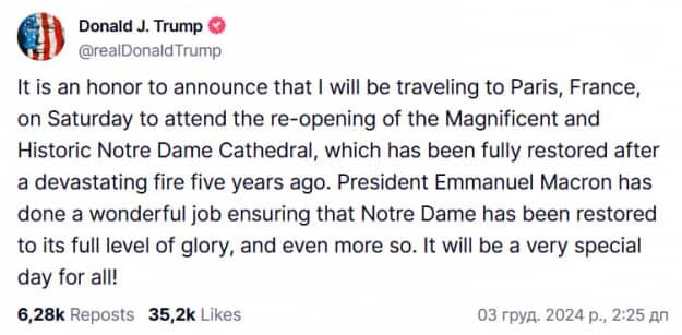 Повідомив, що в Парижі має намір відвідати Собор Паризької Богоматері, який був відновлений після пожежі п’ять років тому. Пише, що Макрон «зробив чудову роботу» з відновлення цієї будівлі.