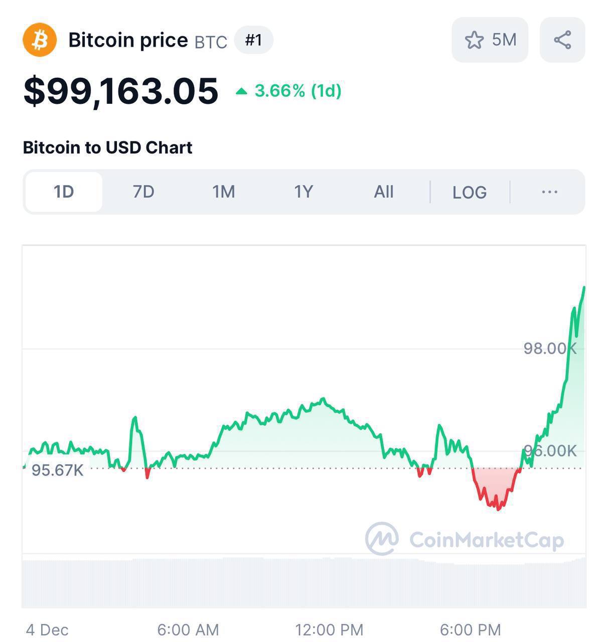 Ціна на Bitcoin перевищила 99 тисяч доларів США