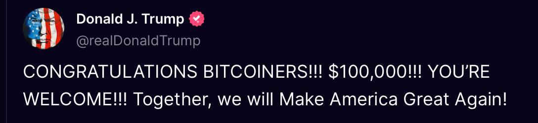 «Вітаю, біткоїнери! $100 000! Нема за що! Разом ми зробимо Америку знову великою!» - написав обраний президент.