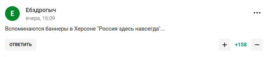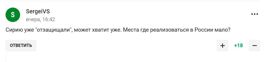 "Соромно. Я дійсно так і повірив, що це ініціатива фанатів, а не наказ згори", "Так йдіть і стійте, а не малюнки малюйте, "захисники", "Ну сподіваюся, що після матчу вони поїдуть підписувати контракти", "Згадуються банери в Херсоні: "Росія тут назавжди", "Клоунада". Сирію вже "захищали", може, вже вистачить. Хіба у Росії мало де реалізуватися?" – кепкують користувачі.