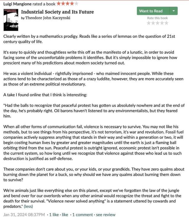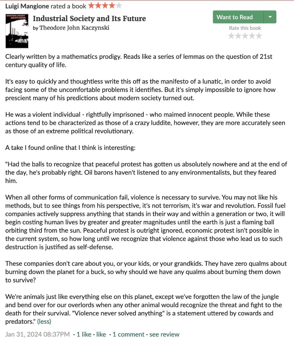 За даними New York Post, вбивця генерального директора UnitedHealthcare Браяна Томпсона (найбільша страхова фірма у медичній сфері) — 26-річний Луїджі Манджоне з Тоусона (штат Меріленд). Це випускник Ліги плюща, він здобув ступені бакалавра та магістра комп’ютерних наук в Університеті Пенсільванії, після цього працював у технологічній сфері. Молодий чоловік критикував капіталізм, але при цьому погоджувався з правими блогерами — наприклад, критикував сучасну модерністську архітектуру, яка "вбиває дух". Він схвалював міркування філософа і терориста Теда Качинського, а також багато читав. В одному з твітів хлопець писав, що падіння народжуваності в Японії є наслідком культури, у якій молодих людей закрили в офісах, пропонуючи їм легкі сексуальні збочення (автомати, спеціальні клуби) замість реального життя. За попередніми даними, мотивом вбивства стала ненависть до медкомпаній через те, як вони ставилися до його хворого родича.