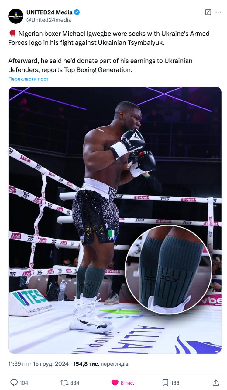 Нігерійський боксер Майкл Іґвеґбе 14 грудня в Києві зазнав поразки від українця Ігоря Цимбалюка у поєдинку, на який вийшов у шкарпетках з написом "ЗСУ".