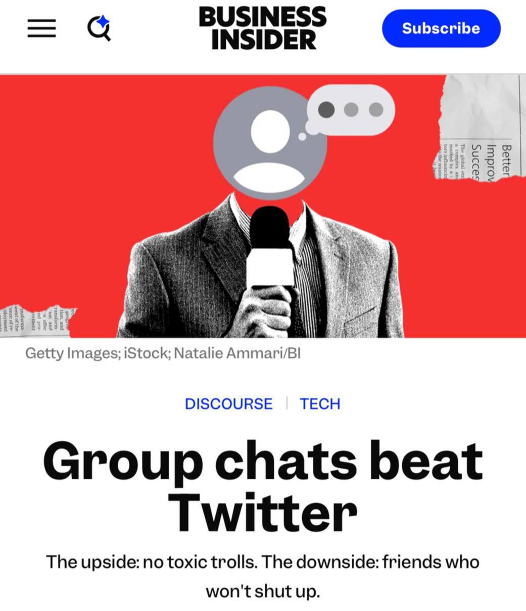Business Insider зазначає продовження тренду втоми від алгоритмів та шуму в рекомендованих стрічках, що спонукає людей до входження в мікроспільноти.